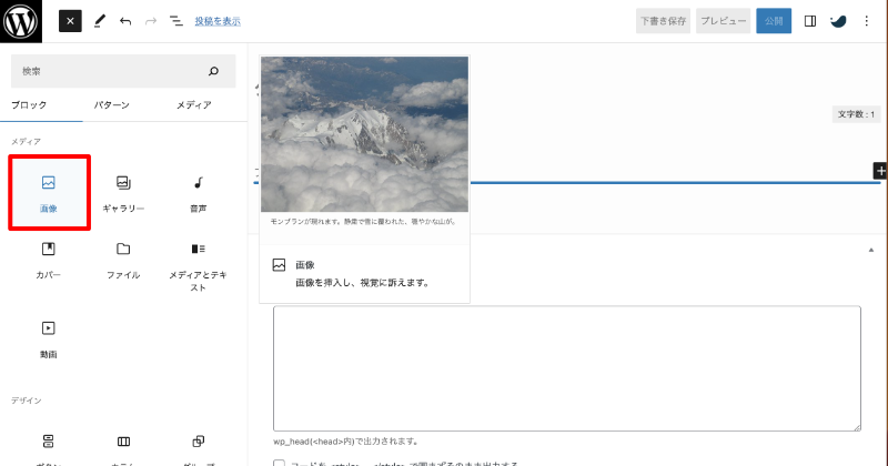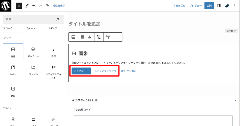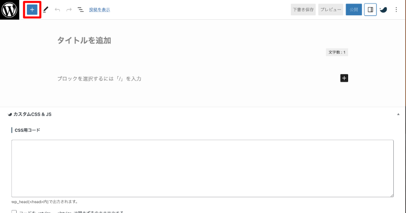 画像を入力する場合は、「ブロック」にキャレット(点滅する縦棒=カーソル)を合わせた状態で、左上の青い「+」マークをクリックします。