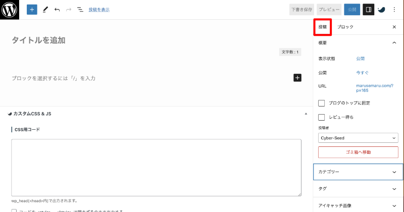 出現したメニューのタブで「ブロック」が選択されている場合は、「投稿」タブをクリックしてください。