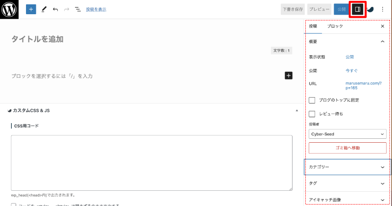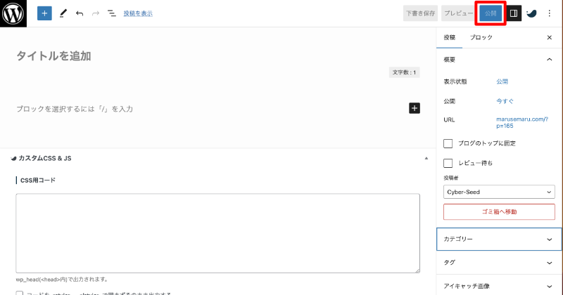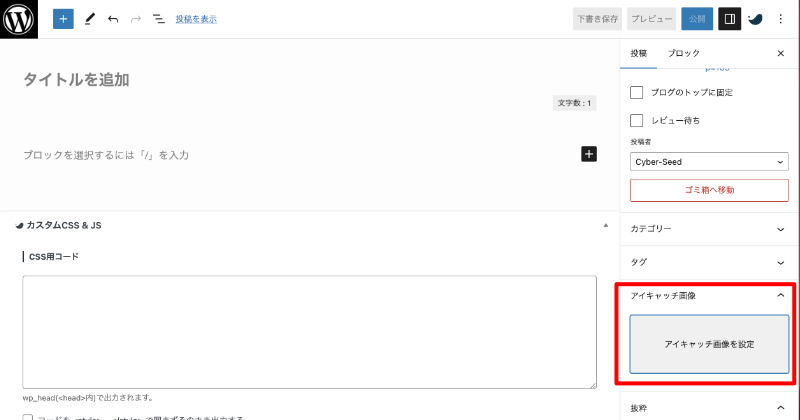 上記「カテゴリー」の下に「アイキャッチ画像」があります。クリックして「アイキャッチ画像を設定」をクリックすると、先述の「メディアライブラリ」に飛びますので、画像を新規にアップロードするか、既存の画像を選択してください。